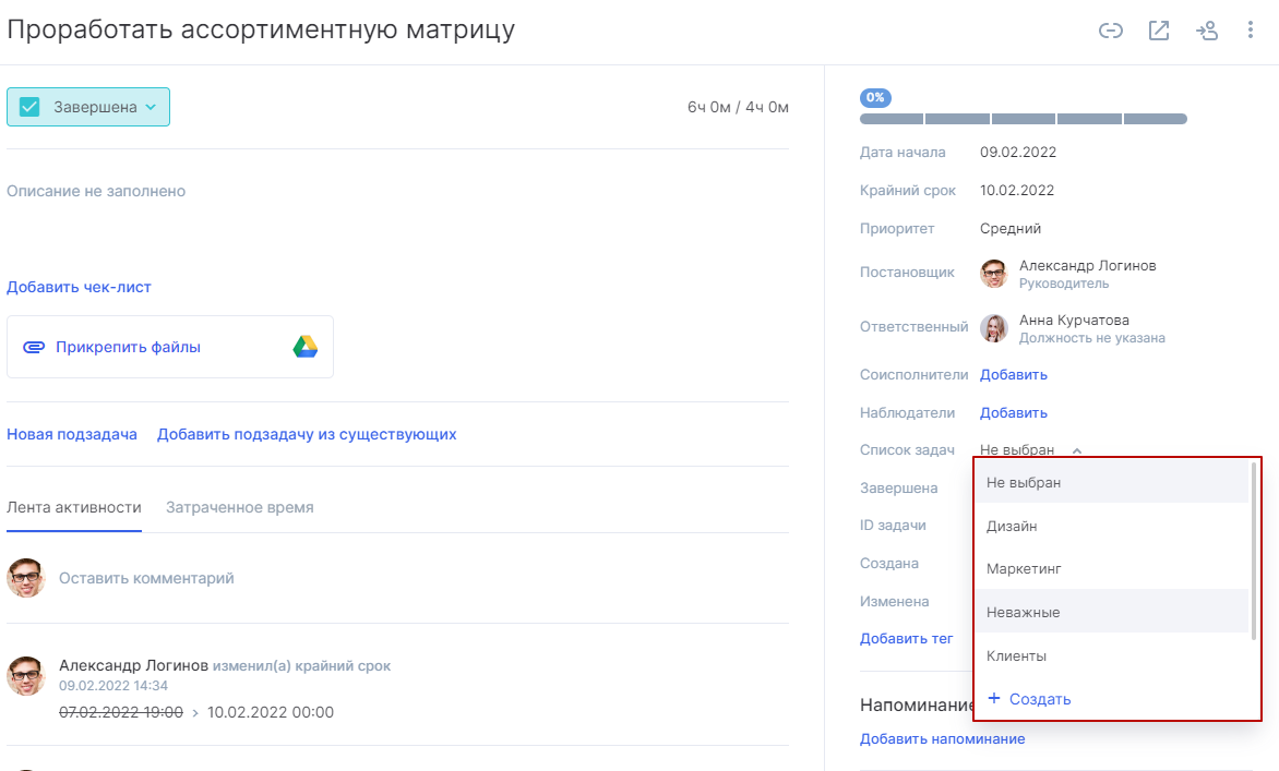 Раньше в уже созданной задаче для изменения или привязки ее к списку нужно было переходить в редактирование. Теперь это необязательно, можно добавить список сразу внутри задачи. +1 к удобству работы в Аспро.Cloud!