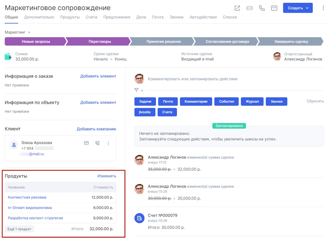 Человеческий фактор может повлиять на работу менеджера: забудет записать необходимый товар или укажет неправильную стоимость услуги. Мы предусмотрели эту ситуацию и добавили привязку товаров к сделкам.
