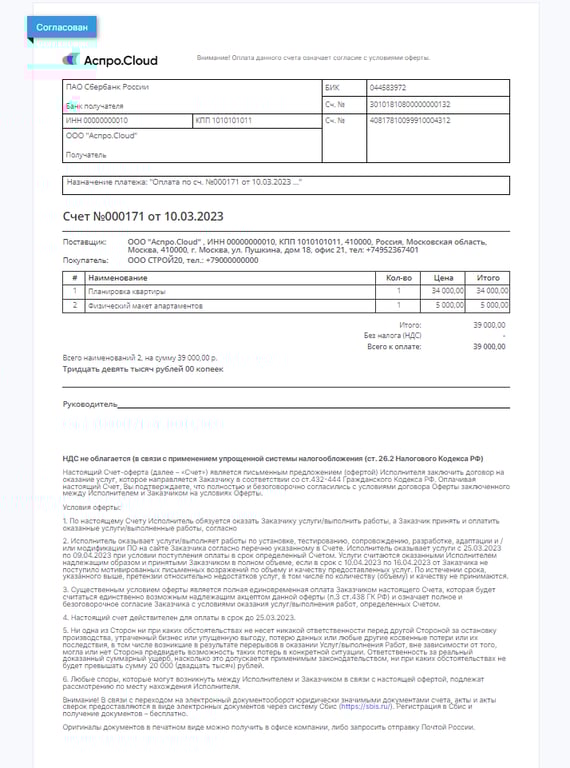 На основе суммы стоимости товаров может формироваться общая сумма сделки. В этом случае в счете или предложении будет отображен список товаров/услуг, привязанных к сделке. Подробнее о видах расчета суммы сделки читайте в базе знаний.