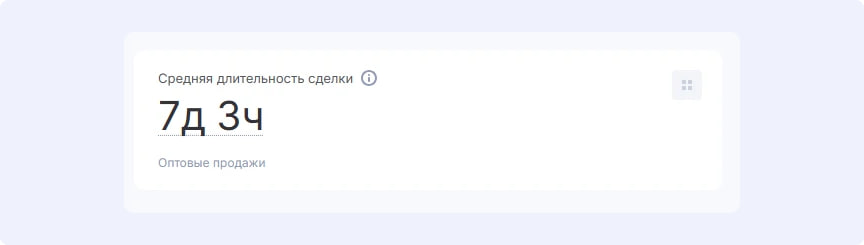 Виджет «Средняя длительность сделки» показывает время нахождения лидов в выбранной воронке — в целом или на отдельных ее этапах.