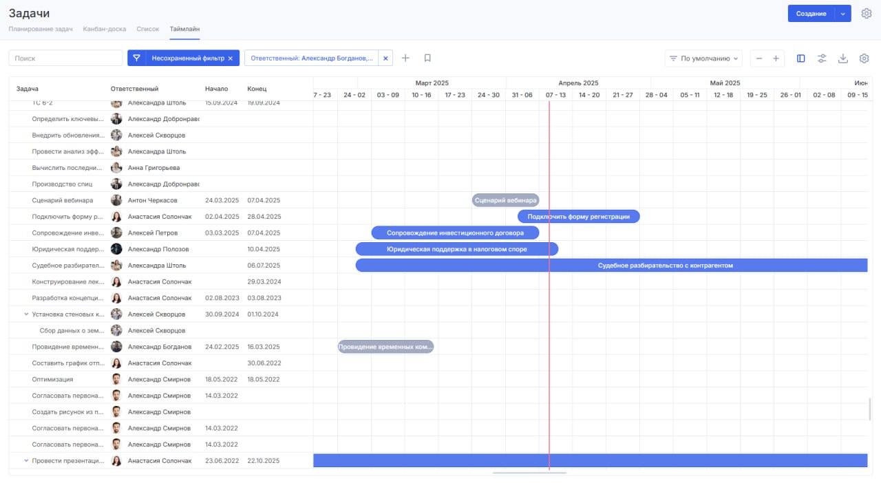 Таймлайн отображает в форме диаграммы все проектные и внепроектные задачи. Чтобы упростить работу с ними, доступны: