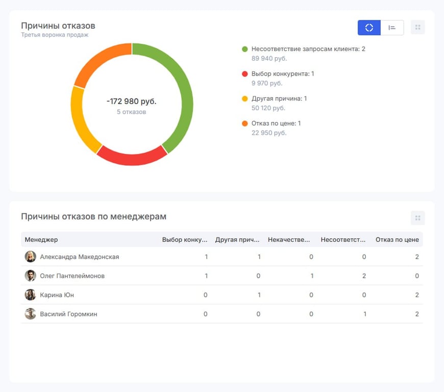 Виджет «Причины отказов по менеджерам» позволяет отследить, с какими причинами отказов чаще всего сталкиваются ваши продавцы. Эта информация поможет вовремя заметить недоработки, провести дополнительное обучение и не упускать новые сделки.